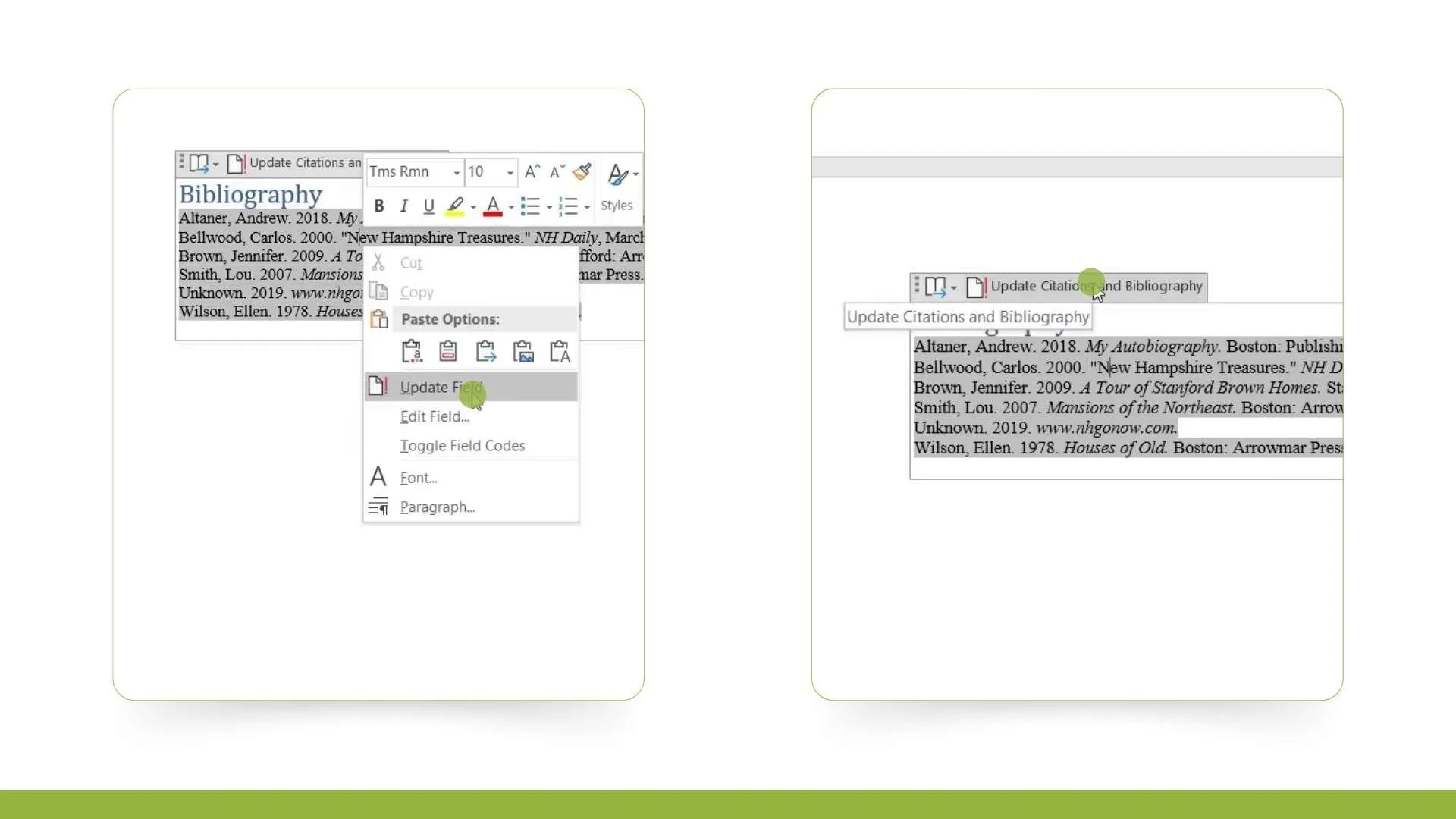 - Note that while the citations in your document might update automatically, the bibliography requires manual updating. To do this, right-click on the bibliography and select Update Field. Alternatively, you can click on the bibliography and use the F9 key for a shortcut.